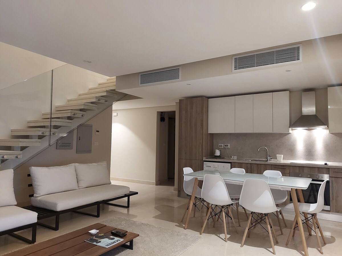 Modern designed penthouse apartment, located in the heart of Jeddah. - The penthouse apartment is located 2 minutes away from Prince Sultan, 4 minutes away from U-Walk Mall. - This modern designed penthouse apartment will meet all your holiday needs. - The apartment offers a fully furnished room, living room area, kitchenette, and bathroom. - The apartment has the essentials of a holiday such as a 70-inch TV, 5G internet, refrigerator, coffee machine, and more.