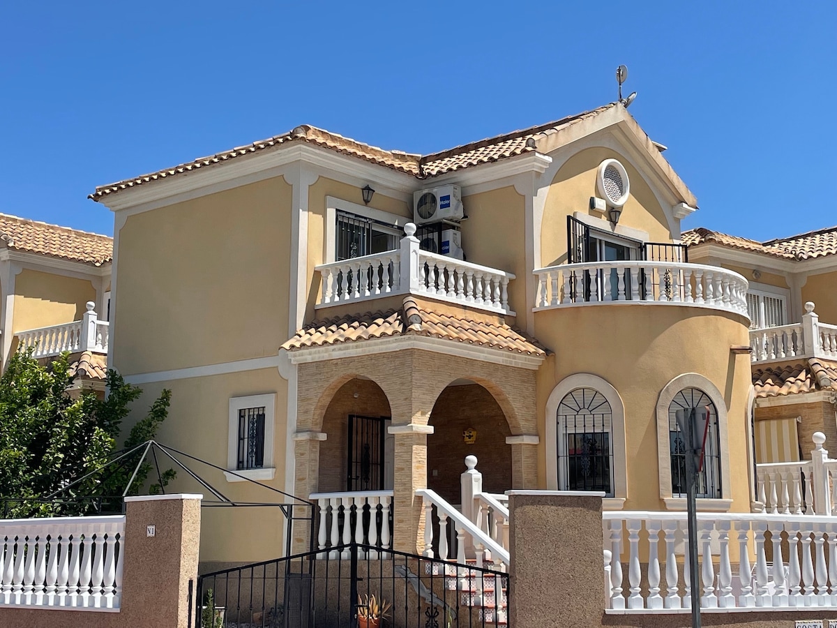 Nyere feriehus i moderne og koselig stil. Ett fullt møblert hjem med fokus på gode senger,dyner,uteområder,møbler og klimaanlegg på alle rom. Det er takparasoll på takterrassen samt parasoll utenfor stuen. Basseng ligger 10 meter fra vår eiendom Huset ligger i et stille og avskjermet boligområde som er barnevennlig. Det er kun eiere av boligene som kommer seg inn med bilen i området. Det er en port på utsiden. Barnevennlig. Kort vei til badestrender, matbutikker, restauranter, golfbaner, etc.