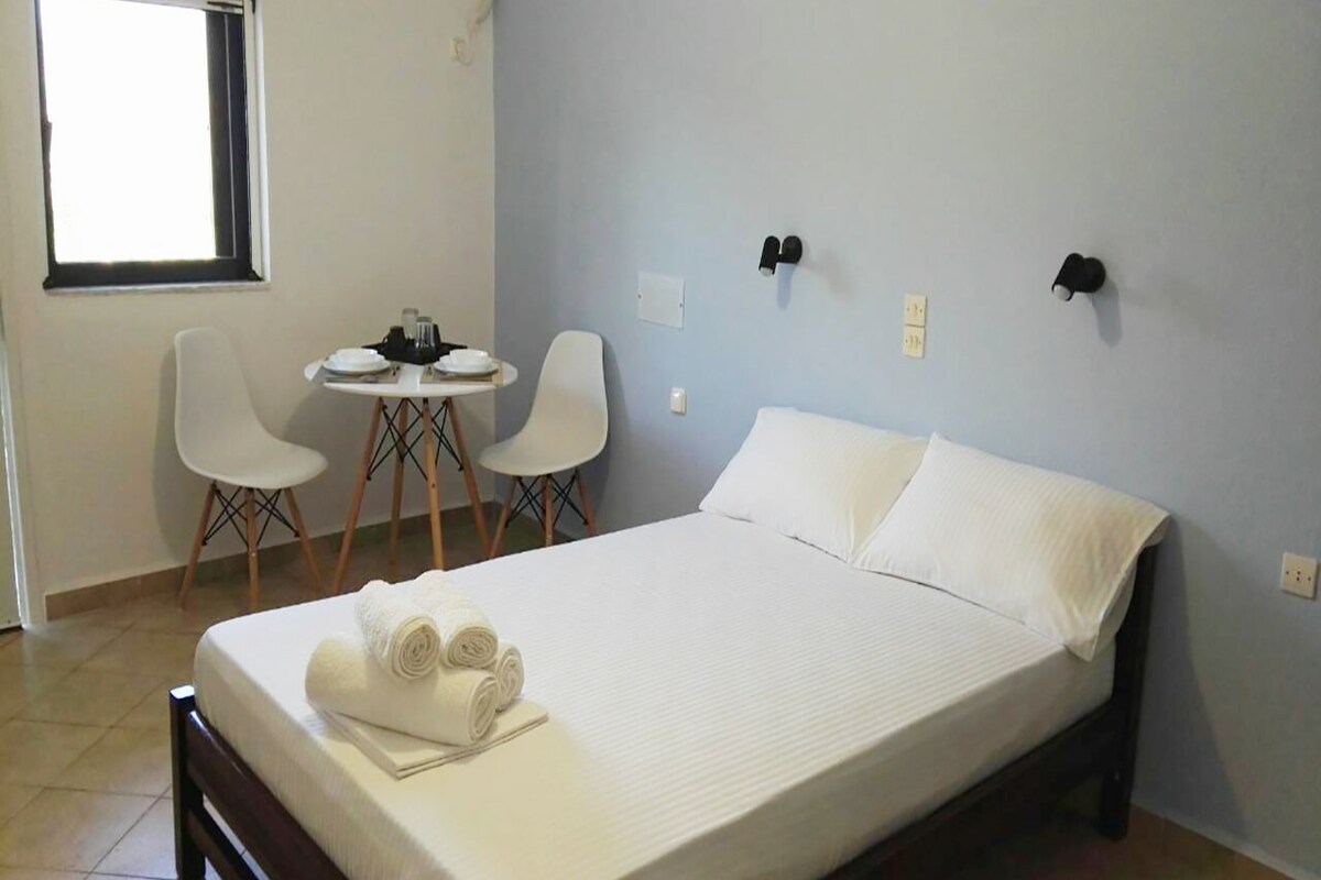 All studio are full of light and airy, for a pleasant & joyful stay. Each of the above types has a fully equipped kitchen with a refrigerator to facilitate preparation of any food or beverage. Moreover there is available free Wi-Fi & air-condition. The room balconies are shaded with their own furniture and chairs on which you can enjoy the spectacular view of the azure sea. The layers are anatomical and have the firm of coco-mat. Items additionally supplied: a device for ironing and a hairdryer