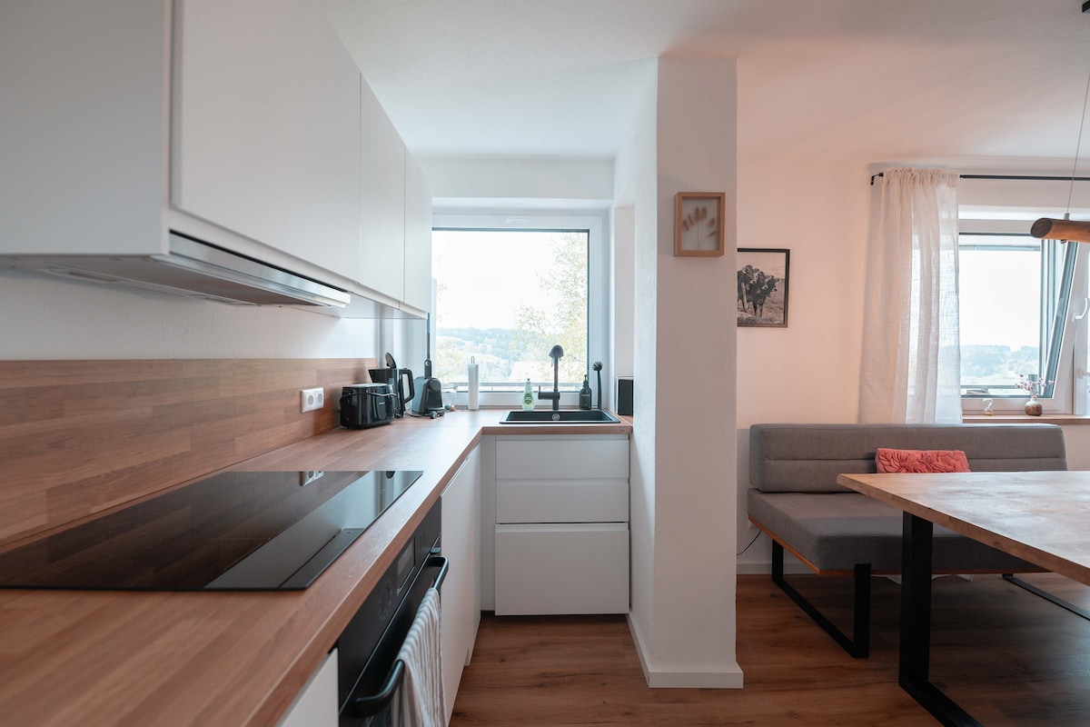 Enjoy your time out in this beautiful and cozy apartment with stunning views of the Grünten and the Allgäu mountains. The apartment is very quietly located, in the middle of the Upper Allgäu, with many ski resorts, cross-country ski trails, hiking trails, swimming lakes, racing bike routes and mountain bike trails at your doorstep. The apartment has underfloor heating, fast Wi-Fi, a sofa bed, is spacious with state-of-the-art amenities and parking. Pretzel and roll delivery on request.