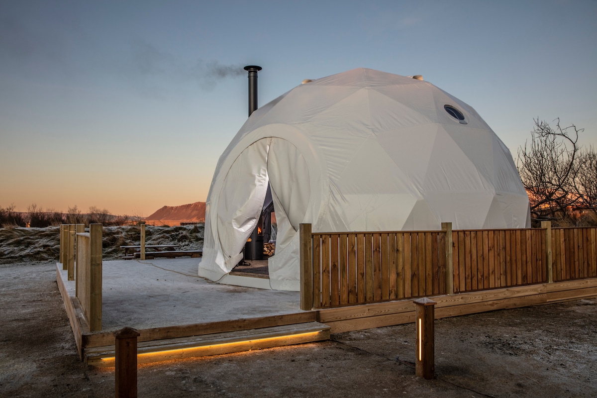 A unique way to comfortably experience nature Enjoy spectacular nature from the comfort of a cozy Luxury Dome with a soft king size bed covered in sheepskins, a burning fireplace, hot tub, complimentary coffee, tea and sparkling wine. Marvel at the dancing northern lights and starry skies through the large windows, with Mt. Esja, the queen of Reykjavík’s mountain range, providing a stunning and often snowcapped backdrop to the north.