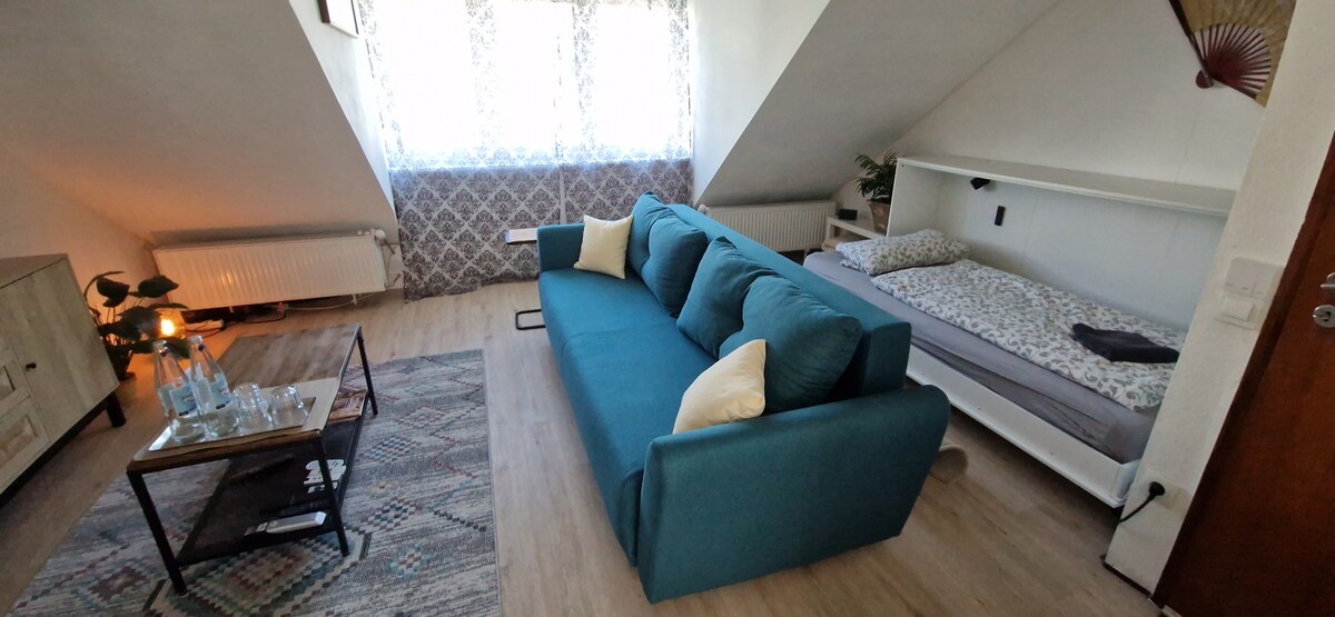 The 30 m2 mini-apartment is located on the top floor of our friendly shared house. It has a small private bathroom with shower and you can use the modern and larger shared bathroom one floor below if you like. In the apartment there is also a small kitchenette where you can prepare simple dishes. Otherwise, you can use the shared kitchen downstairs.
