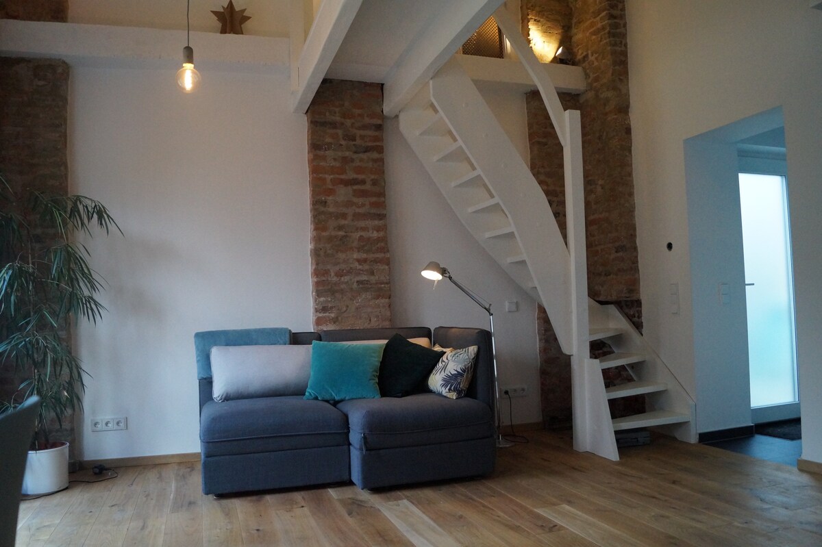 Our newly renovated, large apartment is part of a historic square courtyard. On the upper floor there is a large, cozy kitchen-living room with great views and a fireplace, merging into an open living room, as well as two spacious bedrooms, each with a double bed (1.80 x 2.00 m) and a wardrobe. On the first floor there is a small bedroom with a double bed and a large bathroom with a bathtub and shower. It includes a parking space and a private, fenced garden.