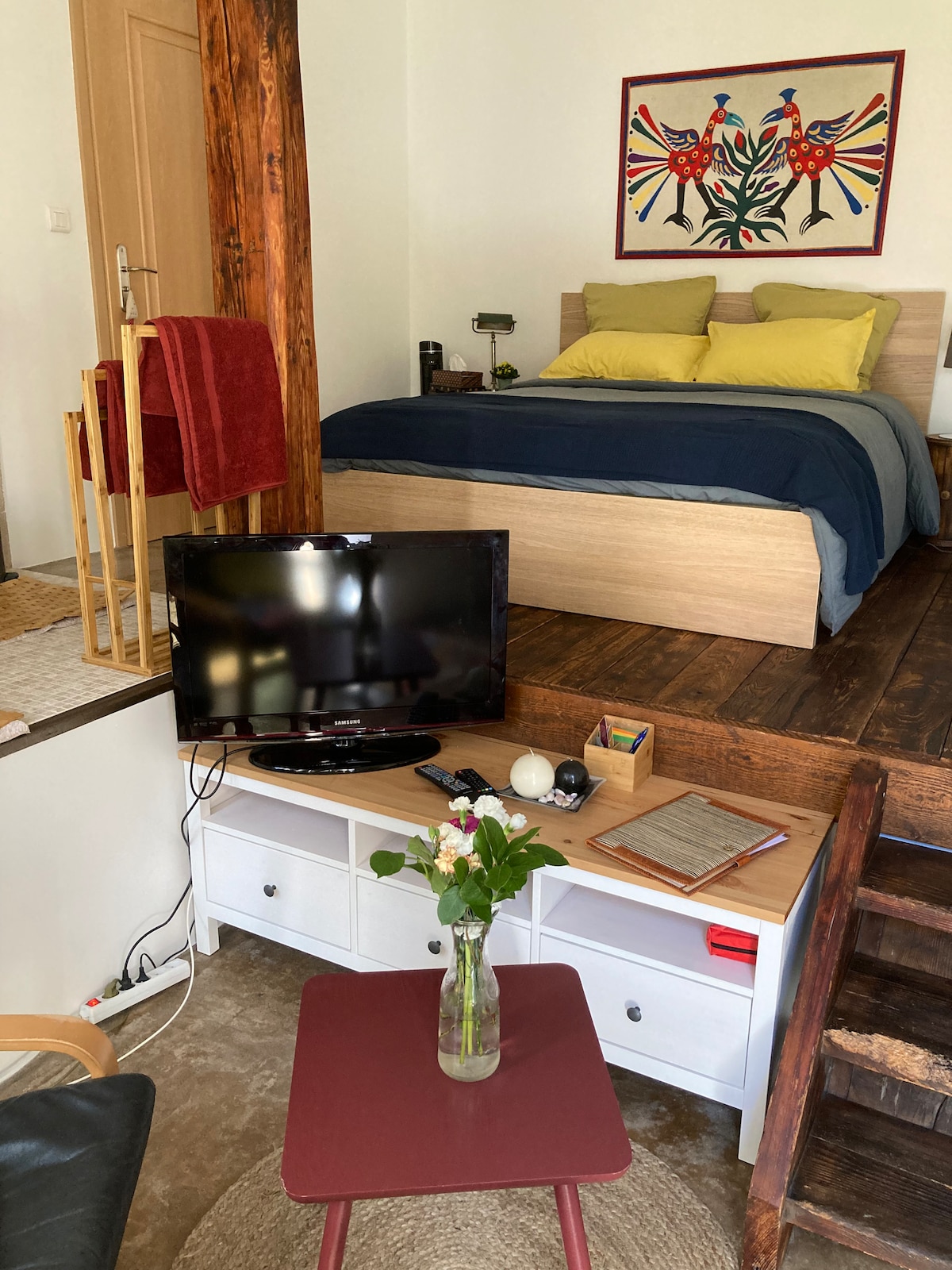 Located on the top floor of a house built in 1790, in the heart of the beautiful Alsatian city of Colmar, this duplex, completely renovated in 2018, will seduce you with its charm and comfort for a getaway for two. Its neat decoration consists of: - on the ground floor, a bathroom with walk-in shower (towels provided), a large fully equipped kitchen, a sitting area with 32" screen TV - upstairs, a 140 cm bed (very firm mattress, bed linen provided) and separate toilet