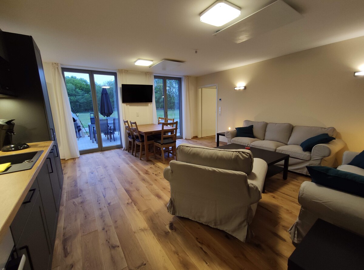 The extraordinary and high-quality equipped earth house apartment (75 sqm) can accommodate up to 4 people and is located in the lower paper mill in an idyllic secluded location directly by the forest. Surrounded by the house's own stream and meadows. Private terrace with BBQ and access to the large garden "Pure relaxation, surrounded by nature".