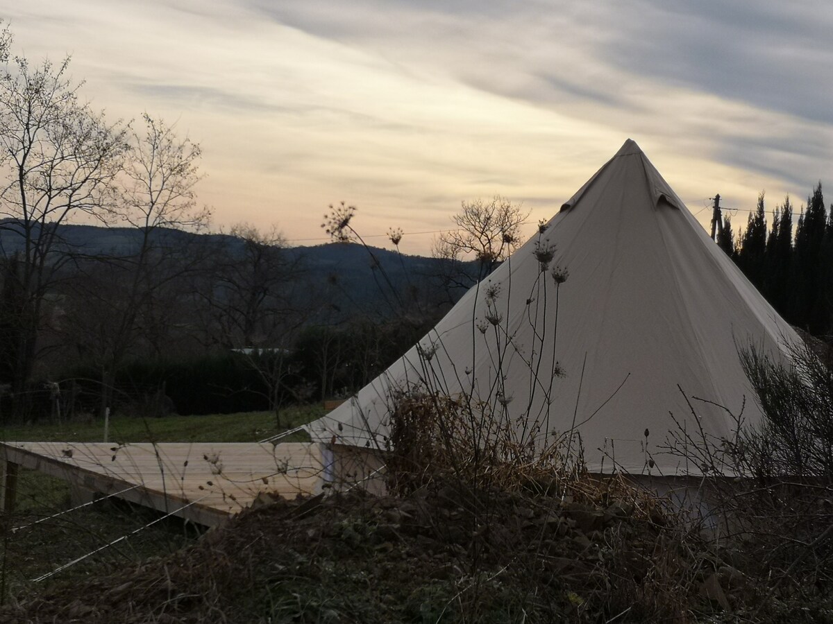 Teepee erected in the center of an apple orchard in a hamlet perched in a mountain of the Mont d'Ardèche Regional Park. A small chalet offering a sanitary area (dry toilet, solar shower) supplied with spring water is at your disposal. Numerous hiking trails will lead you to discover this preserved region. At night, you can enjoy the isolation of the place to appreciate the stars without any light pollution.