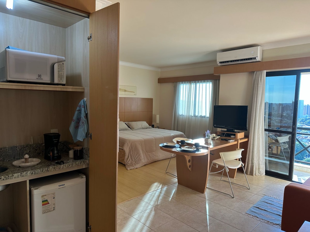 Flat hotel on the 15th floor, beautiful city view, with all services included, such as valet, reception, bar, restaurant, meeting rooms, swimming pool, sauna, gym, playroom and maid service. Located in the heart of Ribeirão Preto.