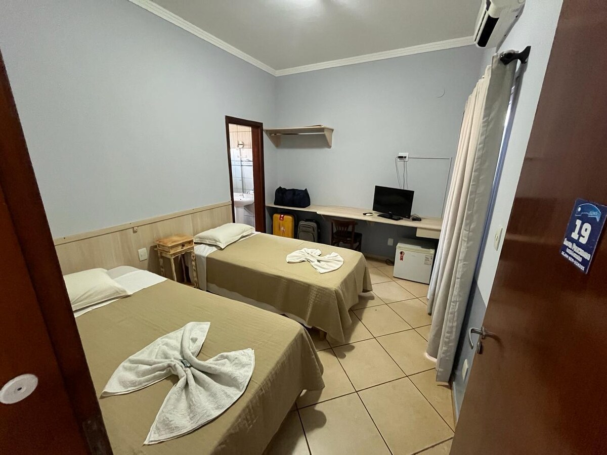 Desfrute de uma estadia memorável onde o conforto e a hospitalidade se encontram em cada detalhe. Nosso quarto oferece um ambiente sofisticado, climatizado e equipado com Wi-Fi de alta velocidade, ideal para relaxar ou trabalhar com tranquilidade. O grande destaque é o nosso café da manhã completo incluso, preparado com produtos fresquinhos, frutas e pães artesanais para começar o dia da melhor forma. Localização privilegiada e atendimento focado no seu bem-estar. Garanta já sua reserva!