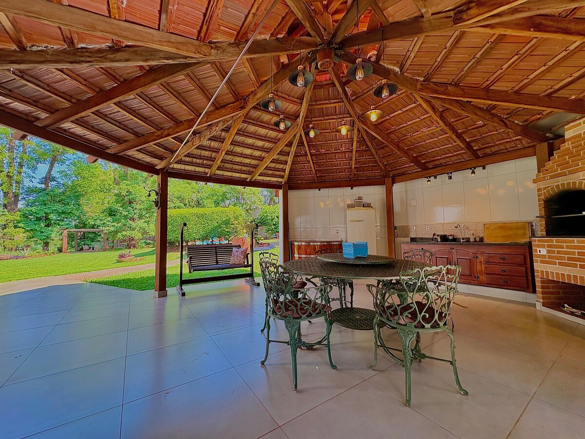 Enjoy a relaxing stay in our wooded farm. The house has 4 en-suites (3 with queen-size bed and 1 with single bed), all overlooking the pool. The gourmet area is ideal for gatherings, equipped with tables, barbecue, pizza oven and firewood. The pool has a waterfall, and the jacuzzi for 2 people is ideal for relaxing. The balcony around the house has sun loungers and a table for 8, perfect for outdoor dining. Come have fun with family and friends!
