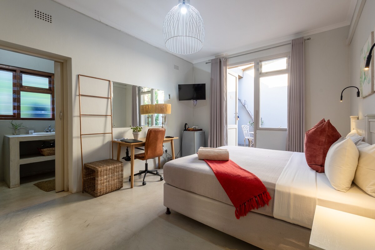 This bedroom has fully equipped kitchenette, tea/coffee trays, microwave and convection plate, DSTV, Netflix and YouTube and is air-conditioned. It has its own private garden and swimming pool views. It is an extra-large room with a study alcove. We do not allow any children due to safely and noise concerns.