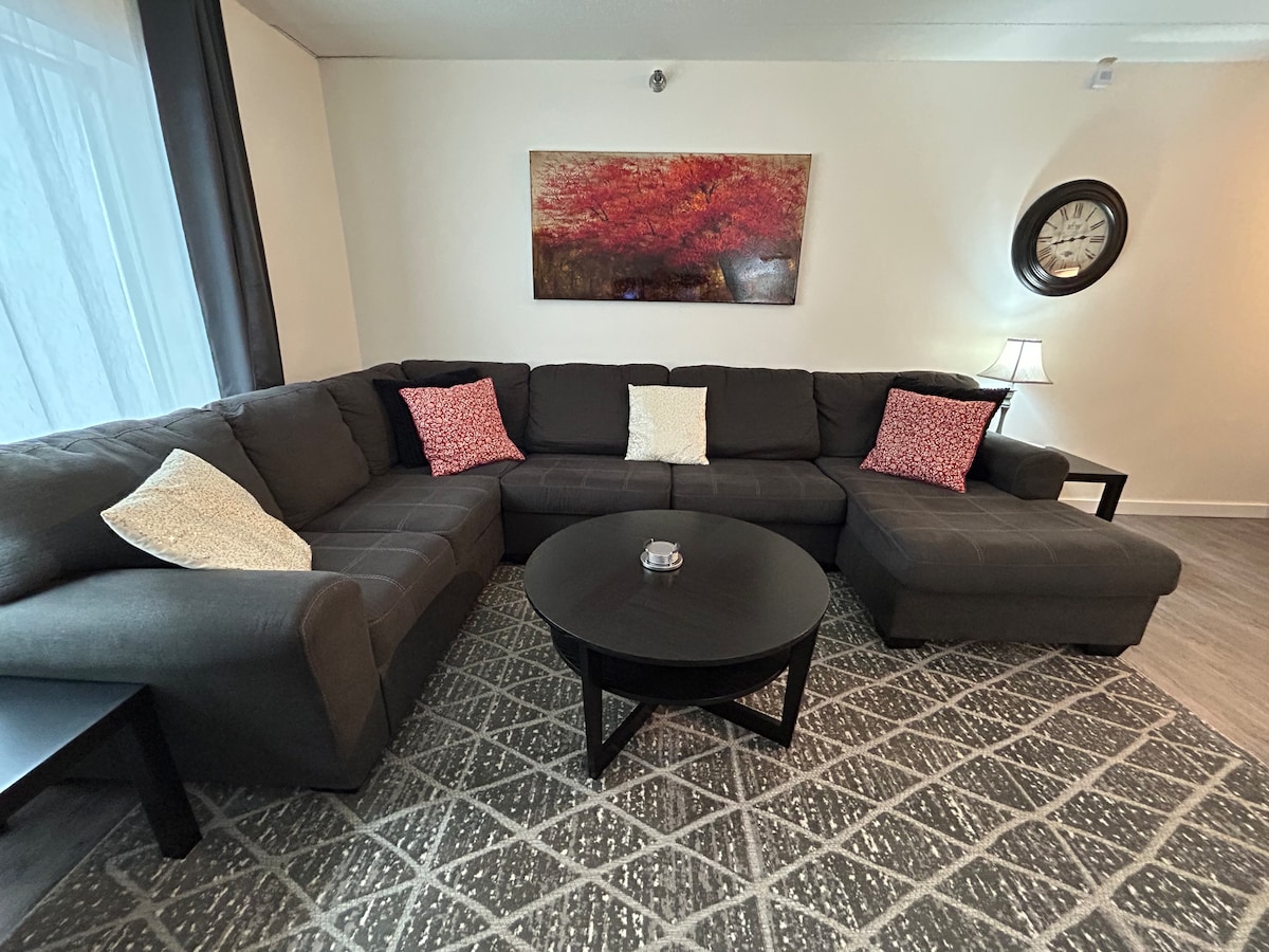 A safe and modern studio space designed for work and relaxation. Discover thoughtful touches catering to your needs as a business traveler, couple, or small group/family. Enjoy fast Wi-Fi, find a dedicated workspace for your laptop at the desk, or explore the lobby's work/meeting spaces. Grab breakfast from the well-stocked bar as you head out to work or savor it while working in the space. Take advantage of the in-unit washer/dryer with laundry pods to keep your clothing clean and professional.