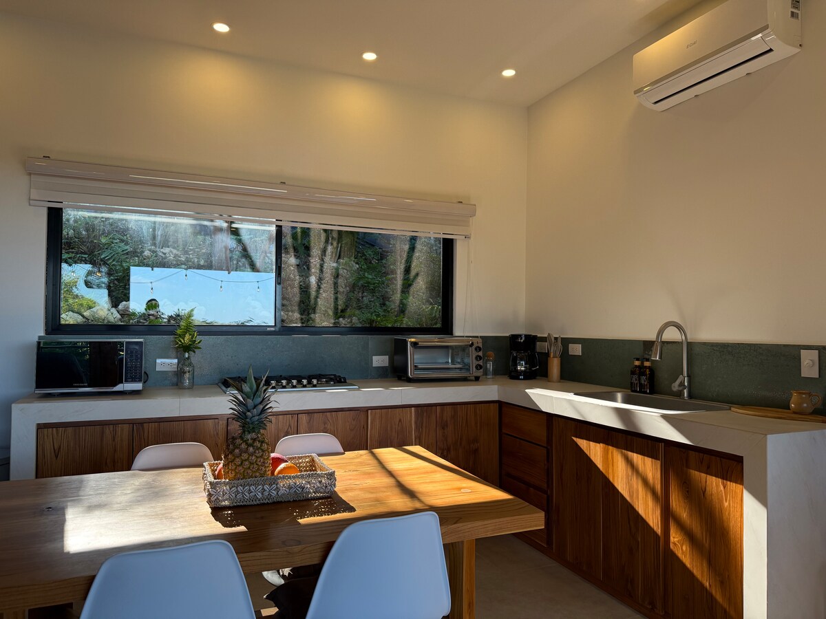 Welcome to Aysana Jungle House, a modern home nestled in the heart of nature, just 5 minutes by car from the beaches and the center of Santa Teresa. Perched above the jungle canopy, the house offers stunning views of the jungle and the ocean, with beautiful sunsets. Designed for a relaxing stay, the house combines clean design, comfort, and serenity. It can accommodate up to 4 guests and provides everything you need to feel at home, surrounded by nature.