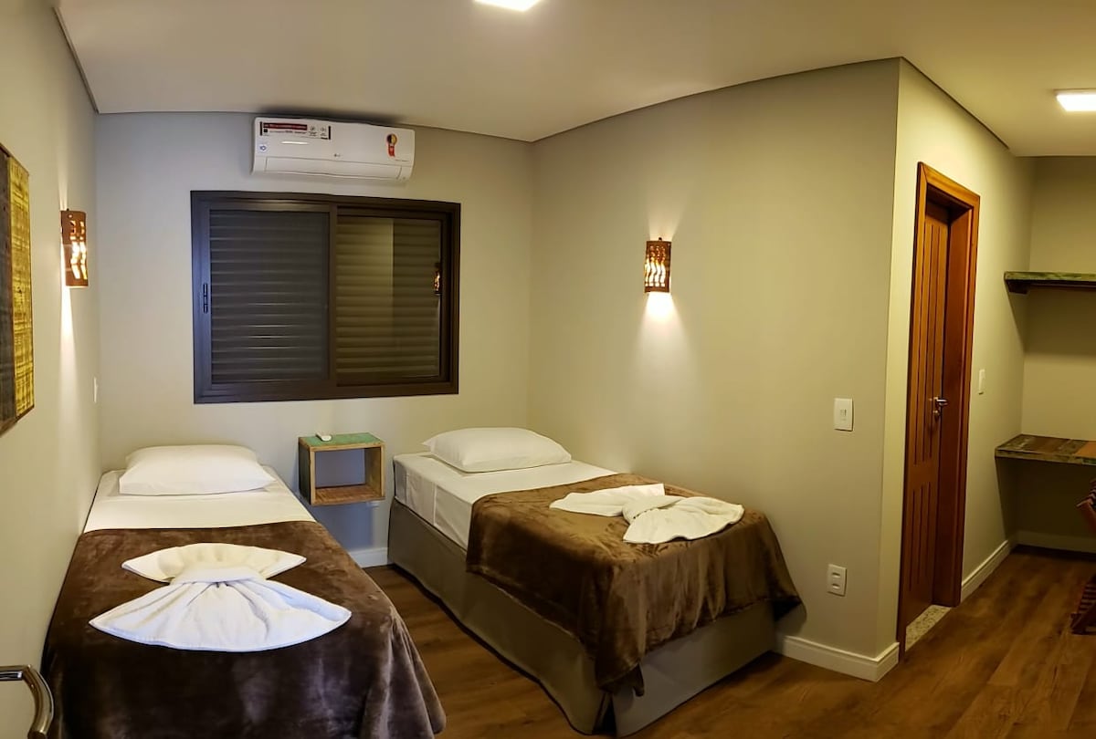 Located just one block from the central square, our flat has private parking for up to two cars, 2 en-suites, a single sofa bed, kitchen and integrated living room, gourmet balcony, air-conditioning in the bedrooms, TV, Wi-Fi and all the utensils you need. The decor was all designed to evoke nature and feel in sync with it, even after arriving from the tours. Our intention is to make our flat your home in Bonito