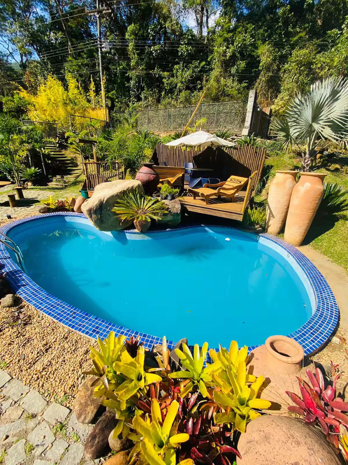 A romantic retreat in the Araras Mountains! Slow down, breathe in the fresh air and renew your energies. Imagine relaxing in a soaking tub overlooking the mountains, enjoying the sunset in the pool, gazing at the stars in the hammock on the deck, or savoring a wine by the fire pit. Charm, sophistication and comfort, surrounded by a lush nature, full of peace and a passionate view. Every detail is thought out so that you can have a unique experience.