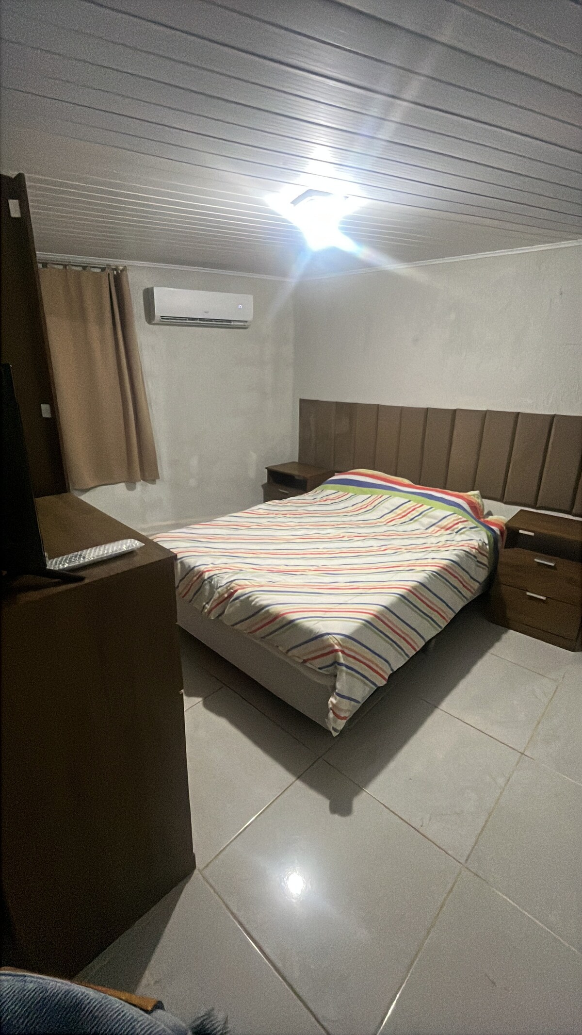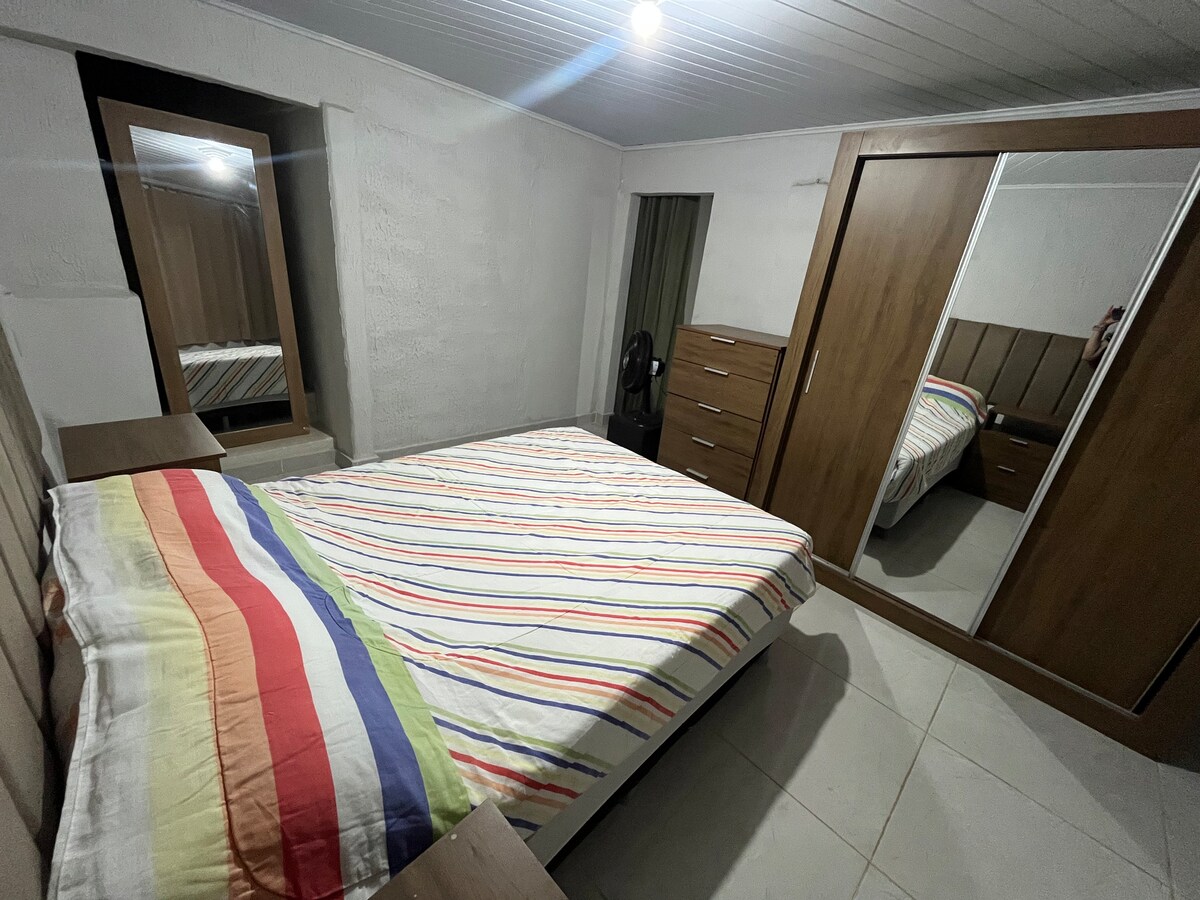 The house has 1 air conditioner that cools the entire house because it is small and has curtains as shown in the photo The house has: 12000btus air conditioning with control (new) 2 Fans 1 refrigerator 1 electric stove 2 sets of bath and face towels 4 pillowcases stored and 2 pillowcases on 2 pillows 3 pillows 2 duvets 1 copper bed 1 iron of pass 3 sheets and double elastic 3 sets of sheets with pillowcase Cutlery, 4 plates, 3 glasses and a small pot 1 small washing machine