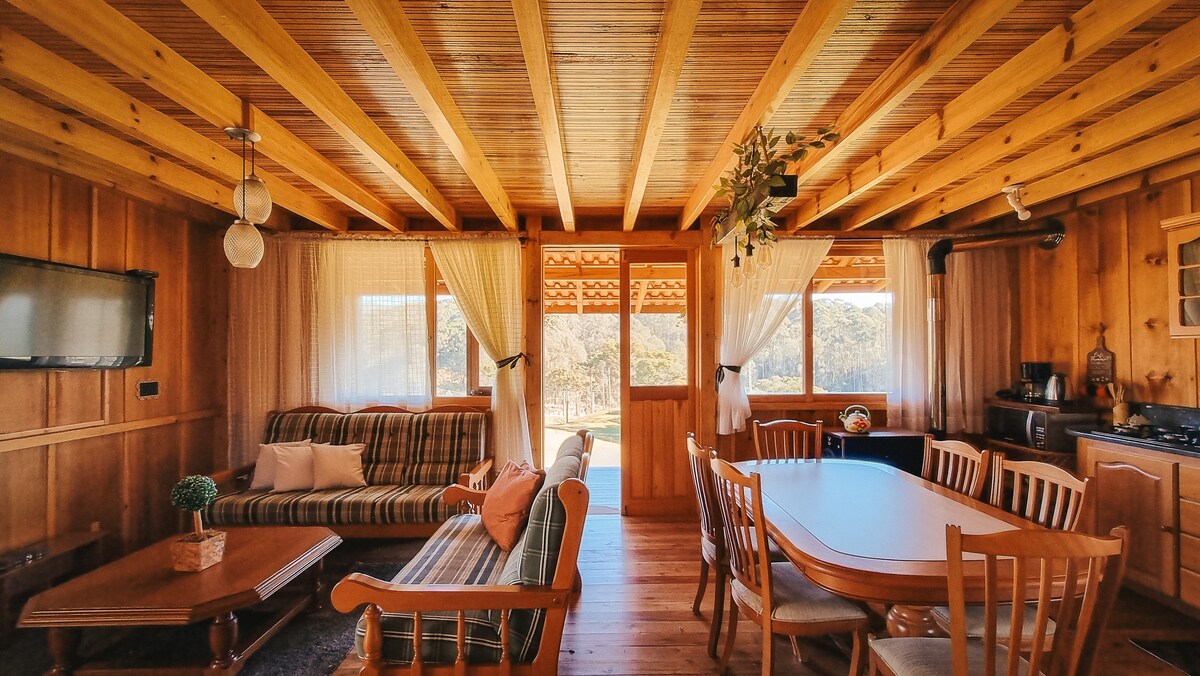 Chalé Sol da Serra é acolhedor e perfeito para reunir a família e os amigos, sair da rotina e viver dias felizes com conforto e tranquilidade noites na praça de fogo, assando marshmallows e brindando sob um céu intensamente estrelado. O ar puro da Serra renovam as energias. O balanço gigante para fotos e risadas inesquecíveis. Cesta de piquenique para tardes leves com quem você ama. Fácil acesso, a apenas 4 km dos serviços essenciais, a combinação ideal entre a natureza e a praticidade.