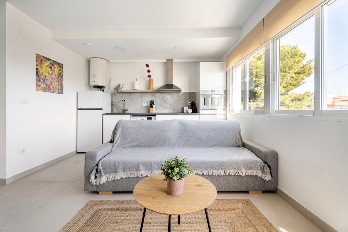 Cozy, bright apartment with a swimming pool, its own parking space, and 250 meters from the beach. Fully equipped, 2 bedrooms with a large terrace, community pool and parking. Very well located, no car is needed to go downtown or to the beaches. Very close to the Mercadona shopping mall. Very quiet residential neighborhood of apartments and close to everything. The airport is 15 km away, about 15 minutes by car. Ideal for couples, business trips, families (with children), and small groups