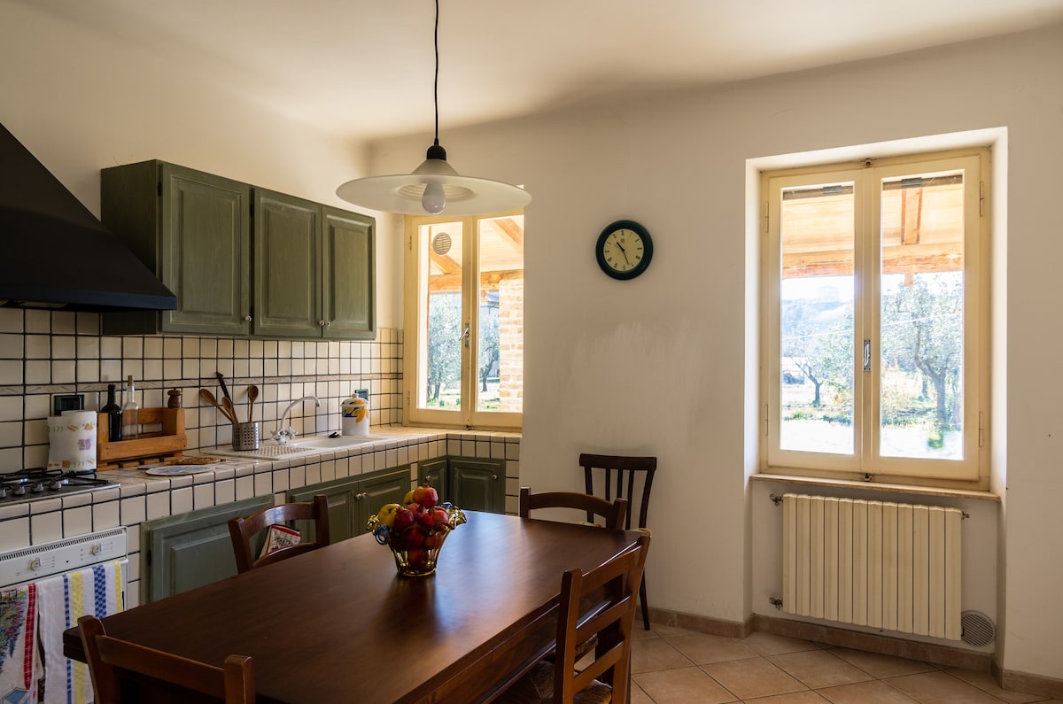 At the foot of Mount San Vicino, on a beautiful hill 420 meters above sea level, in complete tranquility and easily accessible, you can enjoy a beautiful 360-degree view, from the Sibillini Mountains to the Gola della Rossa. Easily reachable in 15 minutes Fabriano, in 20 minutes the beautiful caves of Frasassi, in 30 minutes Gubbio and in 60 minutes Senigallia or the Bay of Conero, in 20 minutes the ducal city of Camerino.