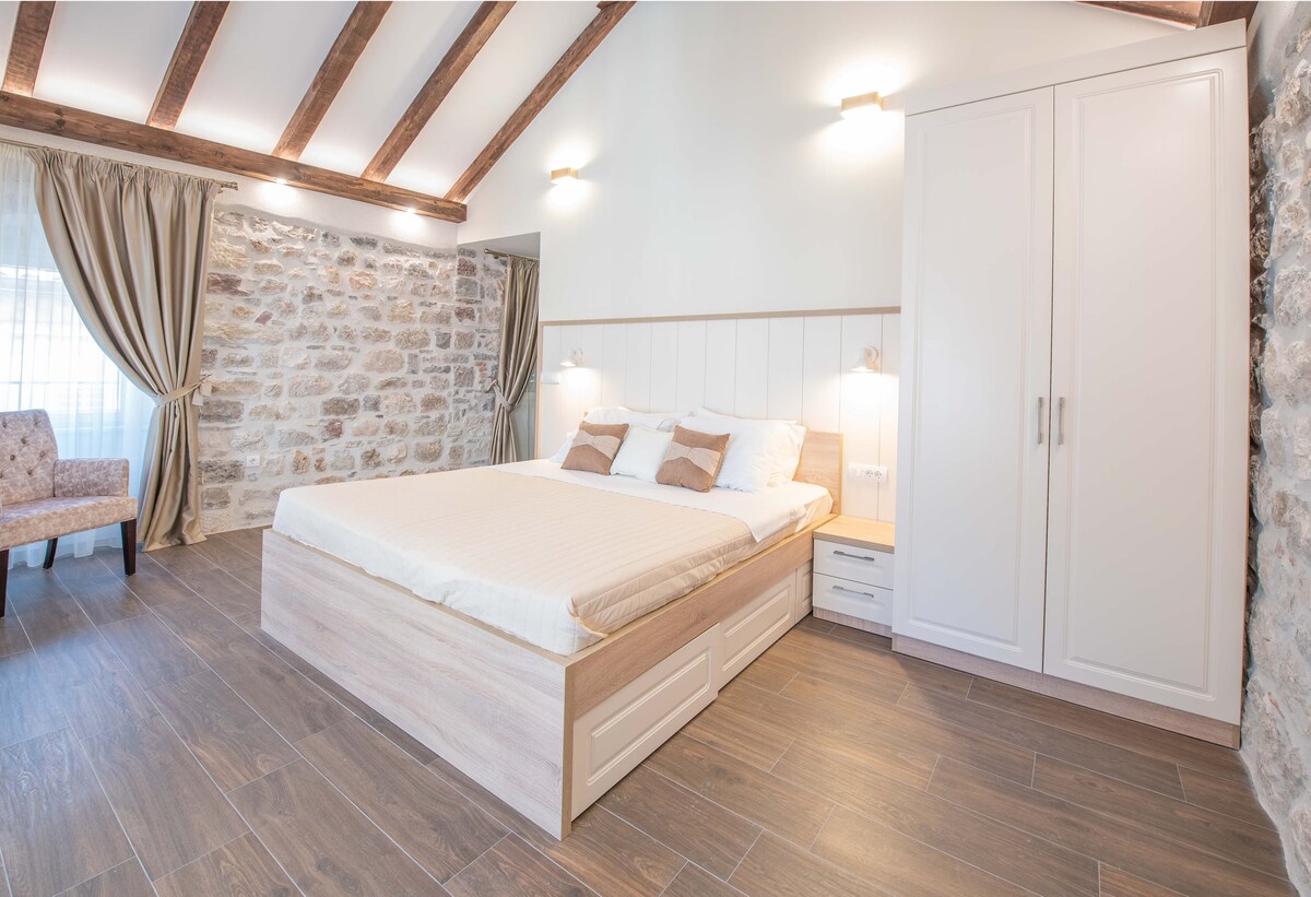 This waterfront studio apartment occupies the entire 1st floor (the floor above the ground floor) in an historic stone home on Kotor Bay in the charming village of Muo. Swimming/sunning is available out in front of the apartment, and Old Town Kotor (the part inside the Medieval walls) is about a 25-minute walk. All the apartments in the building have been recently remodeled and have many modern features -- air conditioning, at-grade tiled showers -- but retains a lot of the historic charm.