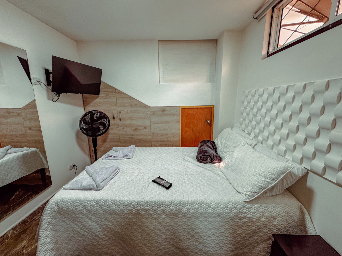 Independent loft room with a semi-double bed, ideal for one person or a couple. This room is located on the first floor, next to the reception, so you may feel a little noise. It has linen, a small night table, a private bathroom with hot water, Wifi, satellite dish and TV, 24-hour reception and surveillance. Morning room service, water bottle. Discounted monthly service for corporations, students and the like.