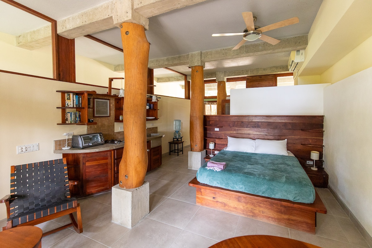 Chic, stylish studio located just steps from town and the beach! Condito Mapache is a new space located just on the edge of the town of San Juan del Sur. Decorated in handcrafted Nicaraguan furniture, and hand painted tiles from Granada, this spacious studio offers you everything you need to be comfortable on your stay in Nicaragua. Wifi, AC, smart TV, Juliette balcony, shared pool, stocked kitchen, washer/dryer and onsite pizza parlour are just some of the perks of this sweet little space!