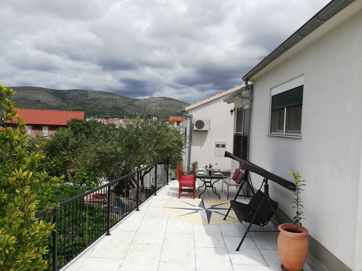 Charming petite house, with beautiful garden, ideal for meals under the stars. Great view at the city of Trogir and the sea. One bedroom, kitchen, living room, bathroom, five minutes easy walk from Old town and 8 minutes by foot from the beach.