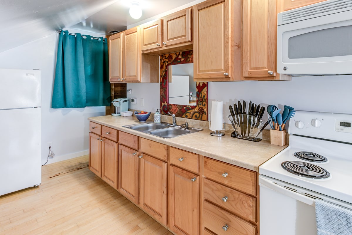 OPEN NO FLOODING IMPACTS. North Bend Downtown Suite is our studio suite with all the amenities of our larger townhomes except scaled down a bit – kitchen, dining area, stocked pantry, and smart TV with Xbox One. Plus a private deck with hot tub and BBQ are right out the back door with a large fenced in back yard behind. Walk 1-3 blocks to most downtown restaurants and shopping. Close to Snoqualmie Casino. While ideal for 1 or 2 guests, you could stay with 3 or 4 if the extra guests are ch