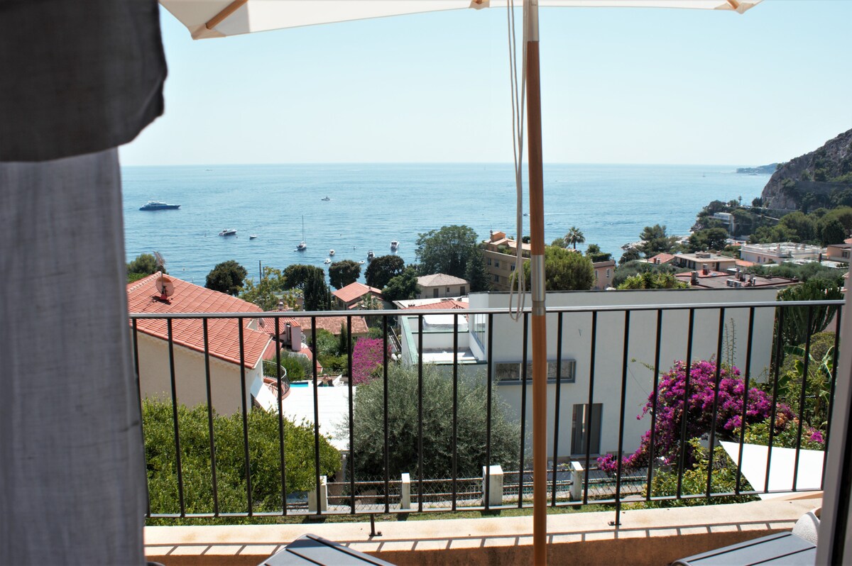 Isidore's house, located between Nice (15 km) and Monaco (8 km) is part of our house with a separate entrance that is totally independent. The air-conditioned duplex includes a fully equipped kitchenette on the ground floor. In front of the entrance, a small table allows you to eat in the shade of the wisteria. Upstairs, one bedroom and one bathroom are accessed by a small staircase. A bay window in the bedroom gives access to a terrace with a beautiful sea view of the bay of Eze.