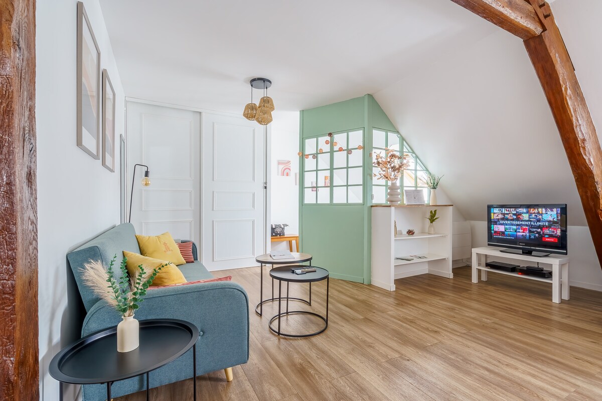 In the Pays d'Oise et d'Halatte, located on the upper floor of a wing of our house, our independent 55 m² apartment will accommodate you alone, as a couple, with family or friends. The calm of our street ensures a restful night. Possibility to dine outdoors. The apartment includes a bedroom with double bed, a bathroom, an equipped kitchen and a double sofa bed. Wi-Fi and TV available to cast your content. Independent access from our house.