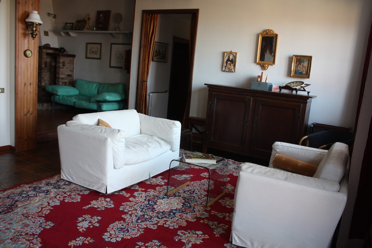 In 2023 my son Guglielmo and I decided to restore the old oratory of a church from the 1600s by creating a two floor apartment: upstairs we have 2 bedrooms equipped with AC and 2 en-suite bathrooms with shower; downstairs a spacious living room with stereo Available a table outside with great view and a nice garden 50 mt away where to have a private wine tasting or barbecue for all the guests of our 4 apartments, after 7pm if booked large in advance Large free parking area 100 mt away