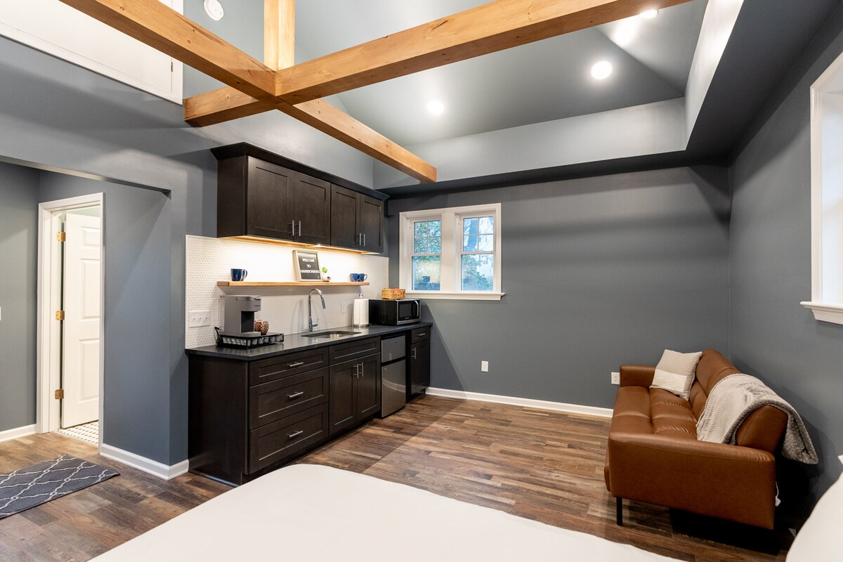 This renovated historic carriage house is 2 blocks from Harrisonburg’s vibrant downtown. The space is light and airy with gabled ceilings and sky-lights that open. It is located on a leafy residential back-alley, with private entrance and off-street parking. JMU’s bluestone campus is a 10 minute walk away. We’ve set-up this space for a range of guests: from JMU parents visiting their children to people traveling for business who are seeking a more textured experience with home comforts.