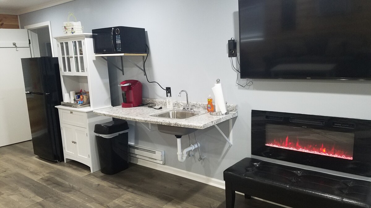Tastefully decorated unit perfect for a relaxing retreat. Great for couples, travelers, or girlfriend getaways! Ground-floor unit (2-story unit with upstairs available for additional charge, otherwise not rented). Queen bed + sleeper sofa. 55" TV w/Showtime. Massage chair. Internet available but spotty due to rural location. Large private hot tub and firepit surrounded by woods and corn! Firewood provided at no charge. Plus a new sauna when outside temps are above 40°F.