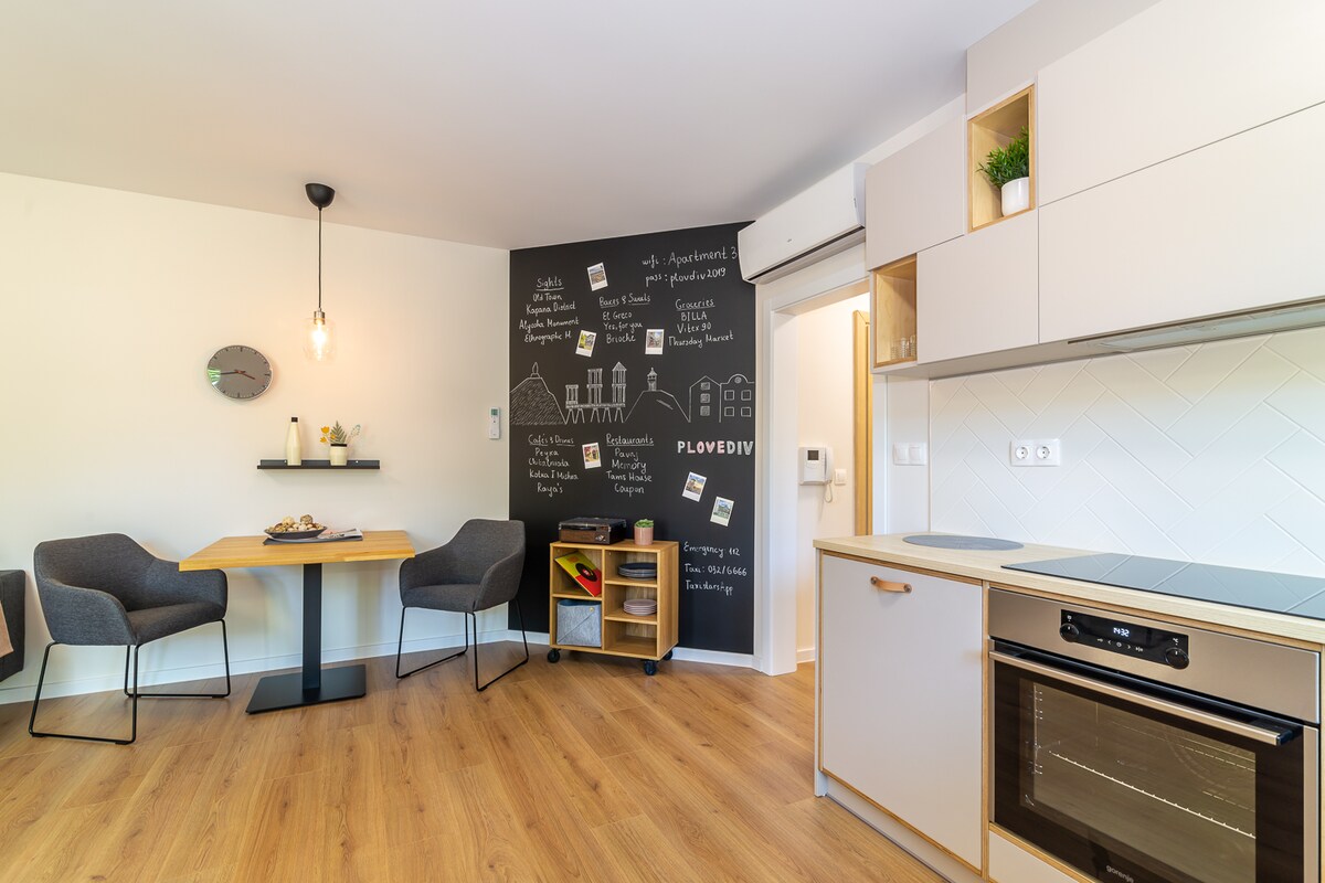 Newly renovated apartment, furnished and decorated in "Boho chic" art style, fully equipped, fast internet connection, located in a quiet residential area next to parks, supermarkets, bakeries, restaurants and shops, a 24/7 coffee shop, a pharmacy, a cinema, a farmers market. Situated cca 10 -15 min walking distance to the very heart of Plovdiv, the Old town and Kapana art district. Enjoy your holiday in Plovdiv in the comfort of that stylish and cozy place!
