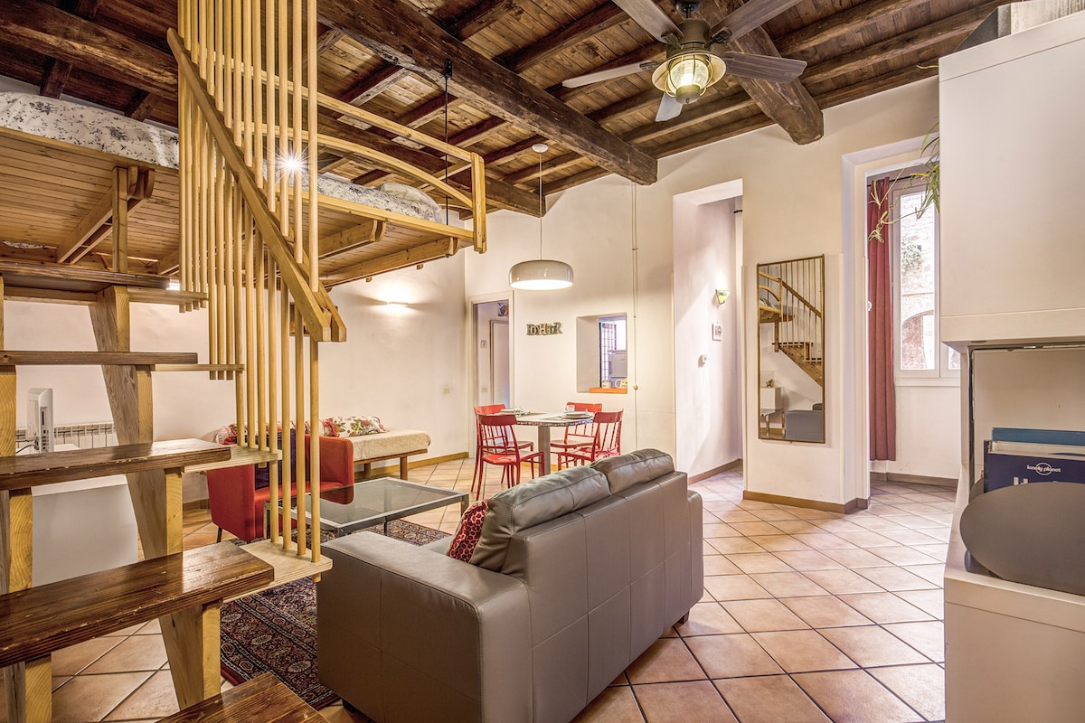 This one of a kind rustic yet elegant loft is full with details in wood, metal and stone, all handmade by Giulio, his owner. The fabulous terrace will take your breath away. How about some coffee with your slippers on while contemplating the Colosseum or watching the sun go down behind the Vatican shadow from the hut tub? Located minutes away from Termini Station but still a peaceful home. The access to the appartment is made by stairs. Breakfast it's on us!