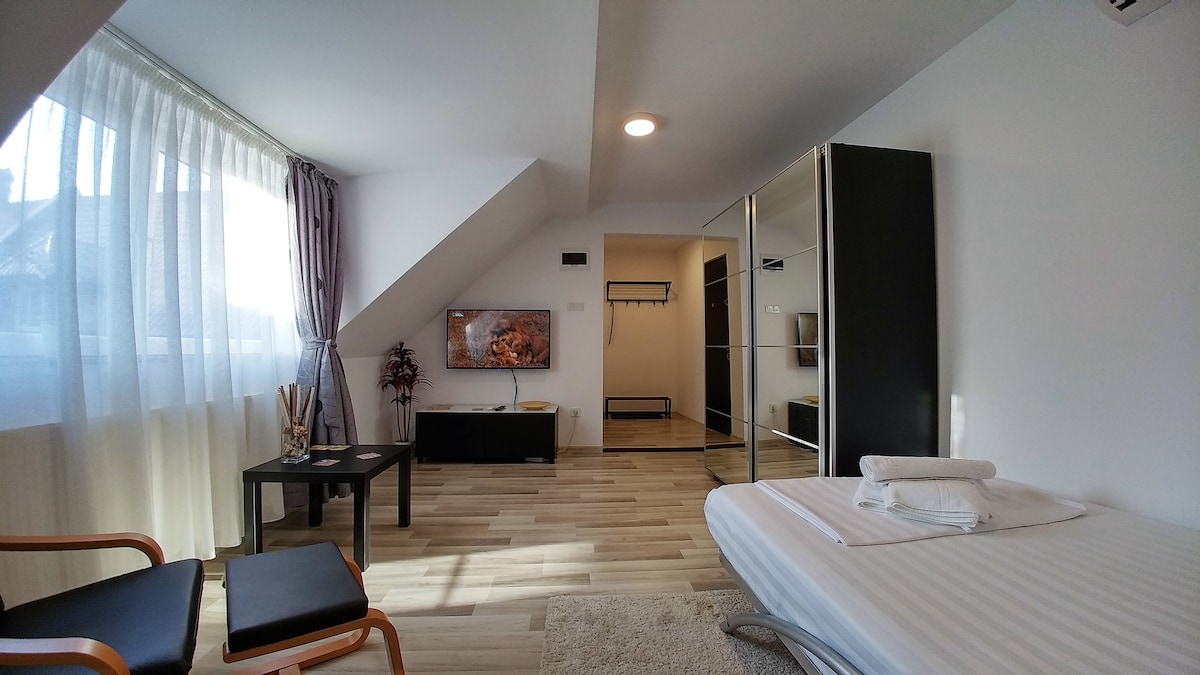My wooden attic suite offers you a perfect and unique place to stay in Brasov. This will be a true Airbnb experience for you. A/C and central heating provided for a cool summer and a warm winter. 5 min by foot from Dracula Castle bus, 5 min by foot from an Auchan hypermarket, 5 min by car to city center.