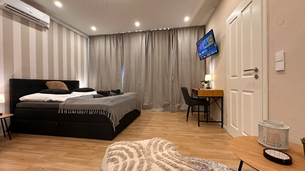 NEST NO.1 - a bright ambience in a clear feel-good design. On more than 110 sqm the guest can expect a spacious dining area, 2 cozy bedrooms with large double bed, a sunny kitchen, a daylight bathroom and a separate guest toilet. Our large living room invites you to linger on the large sofa. The terrace with a small garden offers additional space and in the evening you sit there and enjoy the last ray of sunshine and let the day end. Frankfurt airport: 28km, Frankfurt fair 37km.