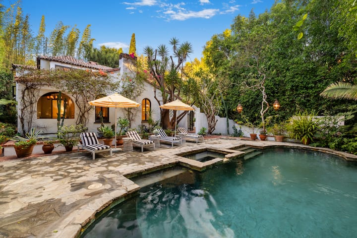 Walled and gated for ultimate seclusion, the expansive double lot bursts with mature agave, towering palms, and vibrant bougainvillea, creating an atmosphere of captivating privacy. A flagstone loggia welcomes you to a lush, secluded garden featuring an al fresco dining area reminiscent of the legendary Chateau Marmont.