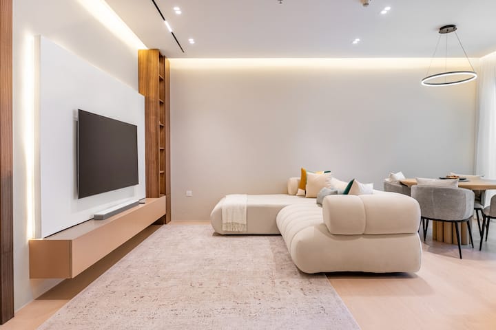 Unwind in the contemporary living room, designed with comfort and sophistication in mind. Large windows offer ample natural light, creating a serene ambiance.