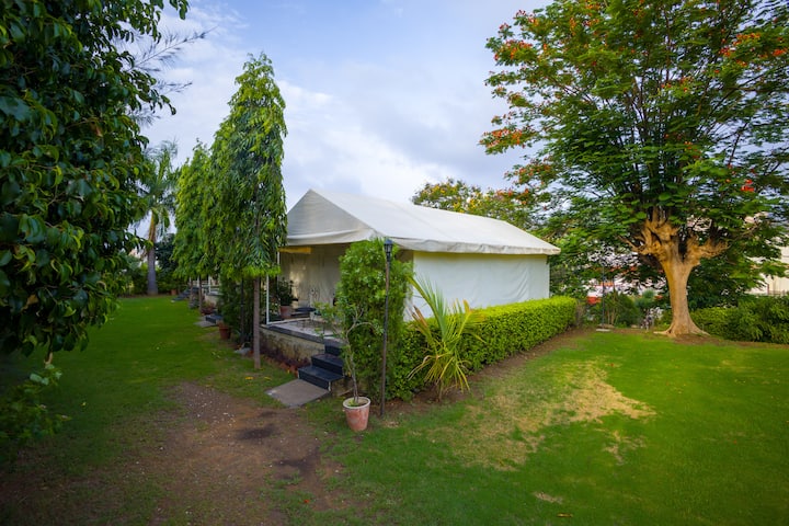 Amidst tranquil landscapes, nestled in a vast estate, a Swiss tent rests, with a private patio enveloped in lush greenery.Step outside to discover inviting spaces—dip in the tranquil pool, dine al fresco beneath the sky, or unwind in the chic lounge.Celebrate life’s milestones in the grand banquet hall, a wedding-ready lawn, a cosy mini party room, or the intimate amphitheatre lounge. Enjoy peaceful sunset strolls through the lush garden, & charge up at our EV station for modern comfort.