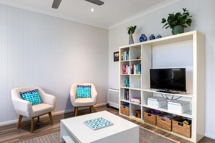Modern 3-bedroom apartment in Huskisson with water views. Walk to beach, cafes and shops. Features smart TV, AC, and fully-equipped kitchen.