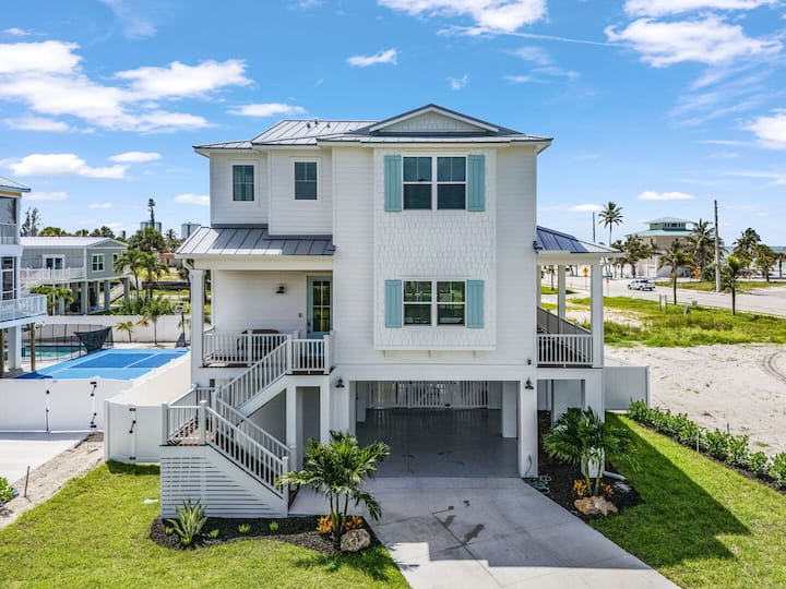 Welcome to Sea Le Vie, a luxurious, newly constructed three-level private home located in the heart of Mid-Island on Fort Myers Beach. Nestled right at the front of a quiet residential street, this beautifully designed five-bedroom, four-and-a-half-bath home is just steps from Beach Access Point #22, making it less than a 2-minute walk from the soft sugar sand and the sparkling Gulf of Mexico.