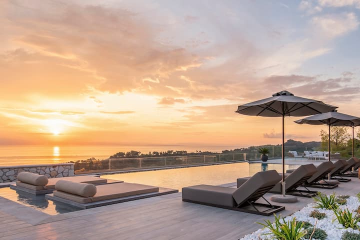 Perched in a super-panoramic hill-top position and immersed in the tranquil countryside of Zakynthos's southeast promontory, Katalania offers seclusion, easy living, a lovely pool, a Jacuzzi, a gym, and flexible accommodation for families and groups of friends. Nearby, there's a good selection of gorgeous sandy beaches, the Marine Reserve of Zakynthos, and the island's charming, buzzing capital.