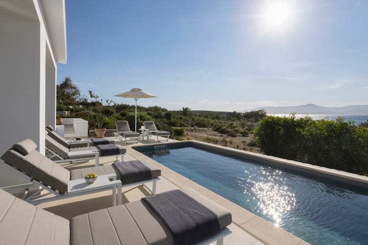 With its pristine white geometrical forms, its welcoming, light-filled interiors, its wrap-around terraces, and its seafront location, Villa Espera is a very tempting proposition indeed. Add a refreshing pool, a beach at the bottom of the garden, enchanting sunrises, and close proximity to the magical little harbour town of Naousa, and it would be fair to say that this charming home lacks for nothing when it comes to summery allure.