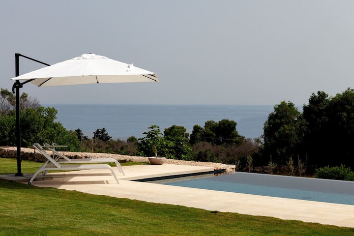 Paths weave through the grounds, past a couple of stone pajare – circular rural buildings peculiar to Salento – and a guest WC and on to an area of manicured lawn. At one edge of this, looking out over the treetops towards the sea, is the splendid infinity pool. At the other is a barbecue and dining area, the perfect spot for long, convivial dinners under the stars.