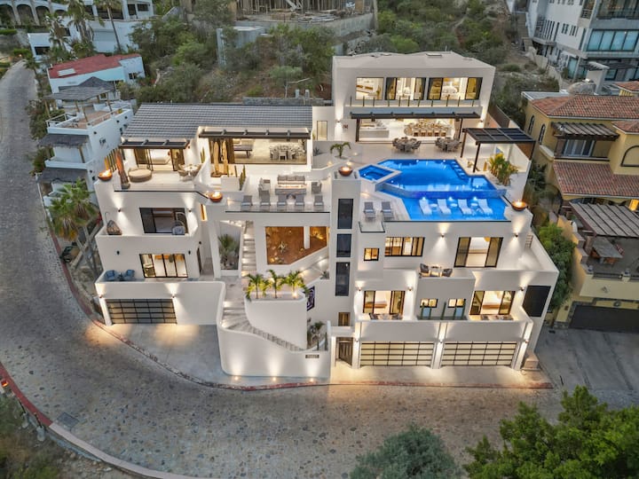 Escape to this stunning modern estate, a new 8-bedroom villa that sleeps up to 26, in the prestigious, gated community of Pedregal, often called the Hollywood Hills of Cabo, where celebrities and notable figures vacation and reside. Just a quick golf cart or car ride to Pedregal Beach, and within walking distance to downtown Cabo San Lucas, this newly constructed 15000 square foot villa combines privacy, luxury, and convenience for an unforgettable stay. Managed by Anneta Group exclusively.