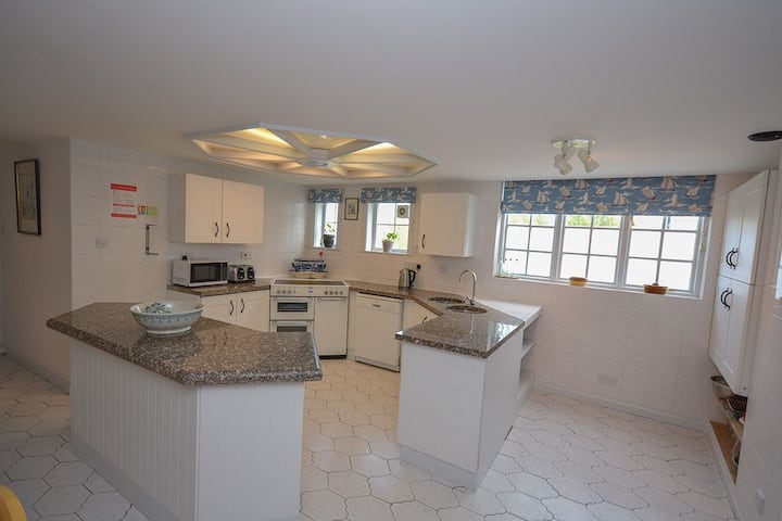 The dramatic octagonal shaped kitchen is so cool! The luxury modern kitchen is at the heart of the house, providing a bright and spacious area in which to use its very well equipped facilities. Prepare your dinner with the impressive Belling dual fuel Ranger Cooker with 5-burner gas hob including wok burner, keep the wine chilled to perfection in the free standing American style fridge freezer and then let the integrated dishwasher do all the washing up! The kitchen also has a microwave, toaster and a pine breakfast table with six matching chairs to enjoy breakfast with family and friends.