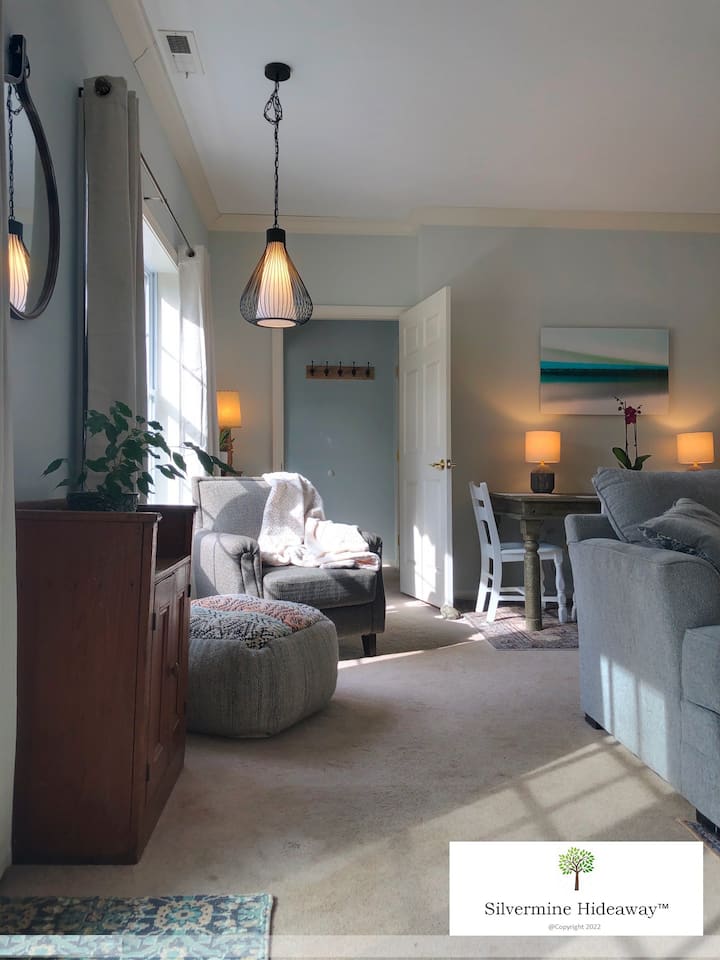 In the living room, you’ll find a large and comfortable sectional couch with plenty of cushions and cozy throw blankets. Read a book, take a nap, do yoga, or just relax in front of the 55” Smart TV. Sign into your Netflix, Prime, or any other streaming account, or watch any of the free services. Central Air Conditioning and Heat ensure comfort during your stay, and the large windows and french doors provide ample light throughout the day. The interior design welcomes you and inspires your creativity.