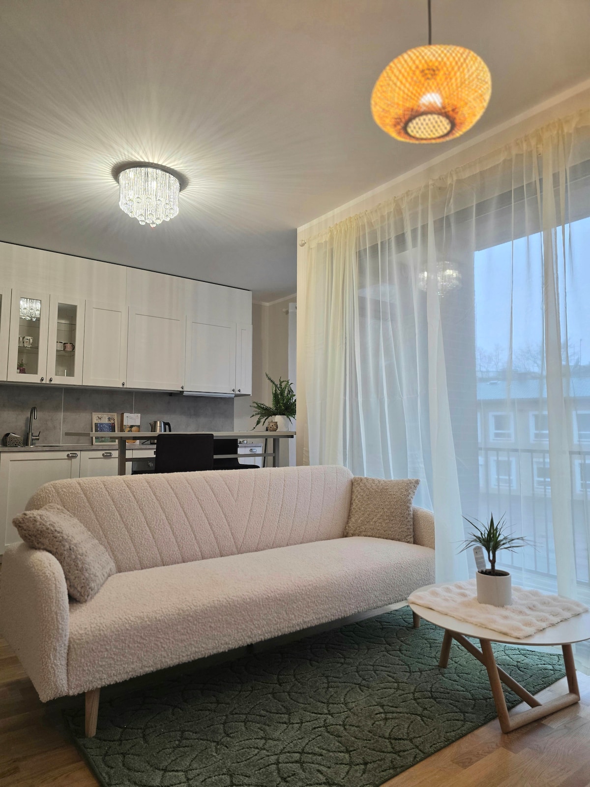 Stylish and cosy design apartment in the silent place with the view from the 10th floor over the river and city. Fully equipped with quality furniture, appliances (like washing machine with dryer, coffee maker, hob, dishwasher, smart TV and even air purifier), dishes, bed linen and all needed bathroom accessories for comfortable living. And of course - the balcony with amazing view.