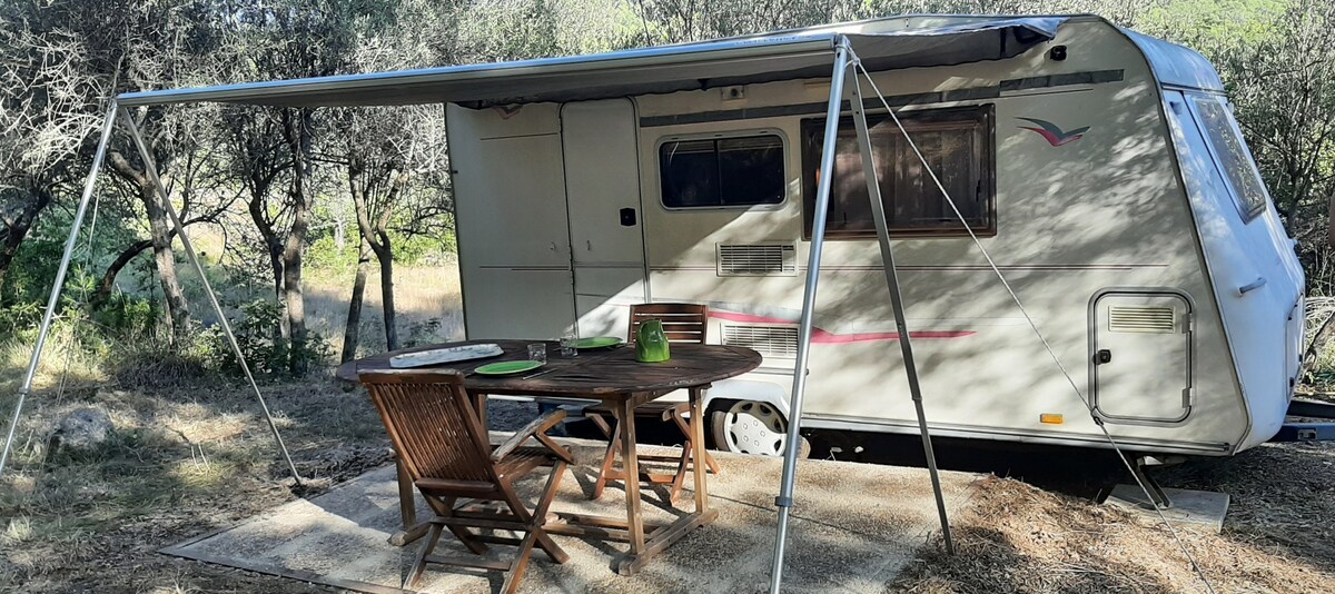 For lovers of calm and cicadas. A single caravan with all the comforts on 2 ha in the heart of nature. Pool access 50 m away (with toilet, solar shower, summer kitchen. BBQ). Owners 100 m away. Electricity, running water, water heater, no Wi-Fi (only Orange network). 130 cm bed, 1 single bed by modifying dining area, sink, fridge, 2 gas fires, bathroom (sink, chemical toilet). Outdoor solar shower. Dishes and bedding provided. Awning, terrace. Easy car access. Video tour on request