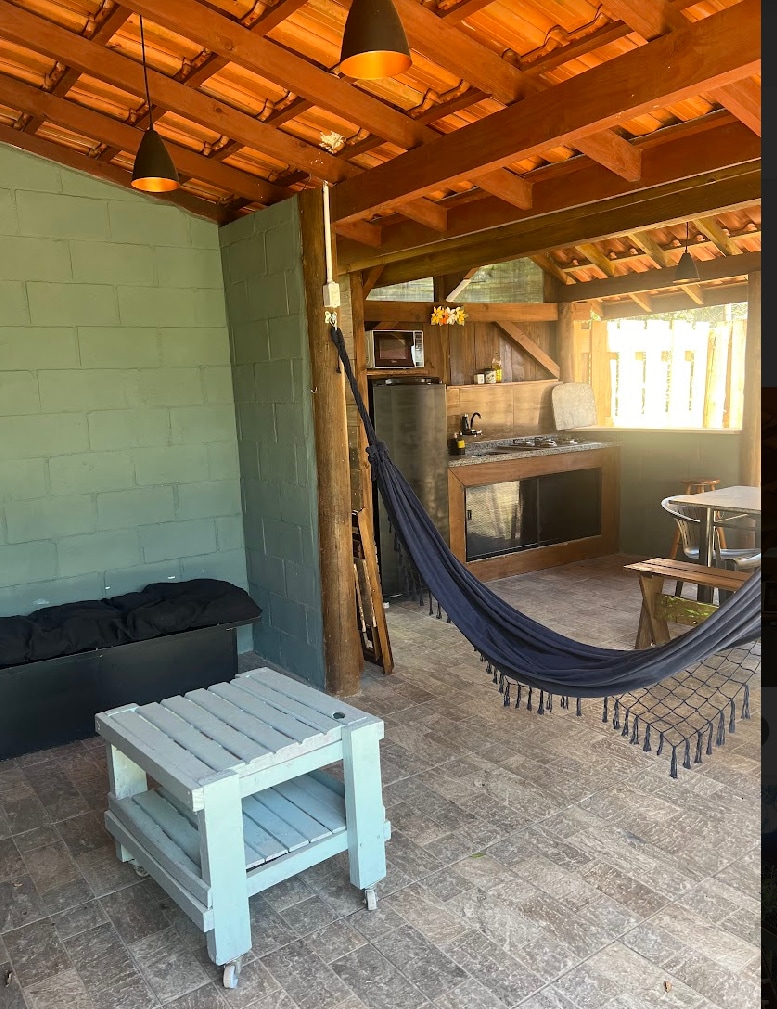 EXCLUSIVE HOT TUB SPA ON THE DECK OF THIS SUITE. Grandma's suites are a quiet, peaceful place with a large patio in front. It is in the back of Cantina Nona Inês, near the Ibiraquera bridge. 10 to 15 minutes from Rosa, Luz, Ouvidor, and Barra Ibiraquera beaches. It has air-conditioning, a mini kitchen with an electric stove, a minibar, a microwave, an electric kettle, etc. TV, Wi-Fi, private bathroom, balcony with hammock. Portable barbecue. Self check-in and check-out with a lockbox.